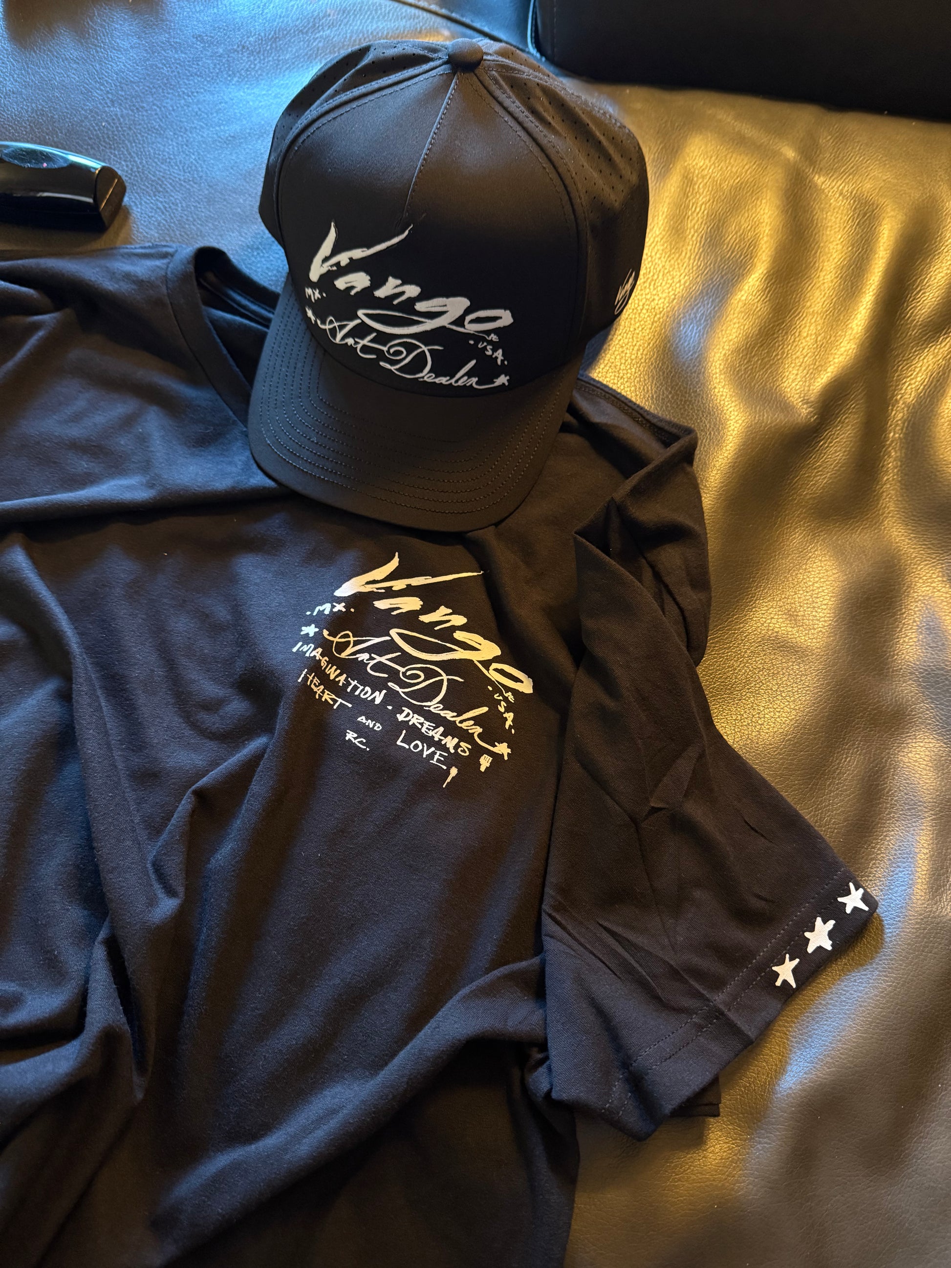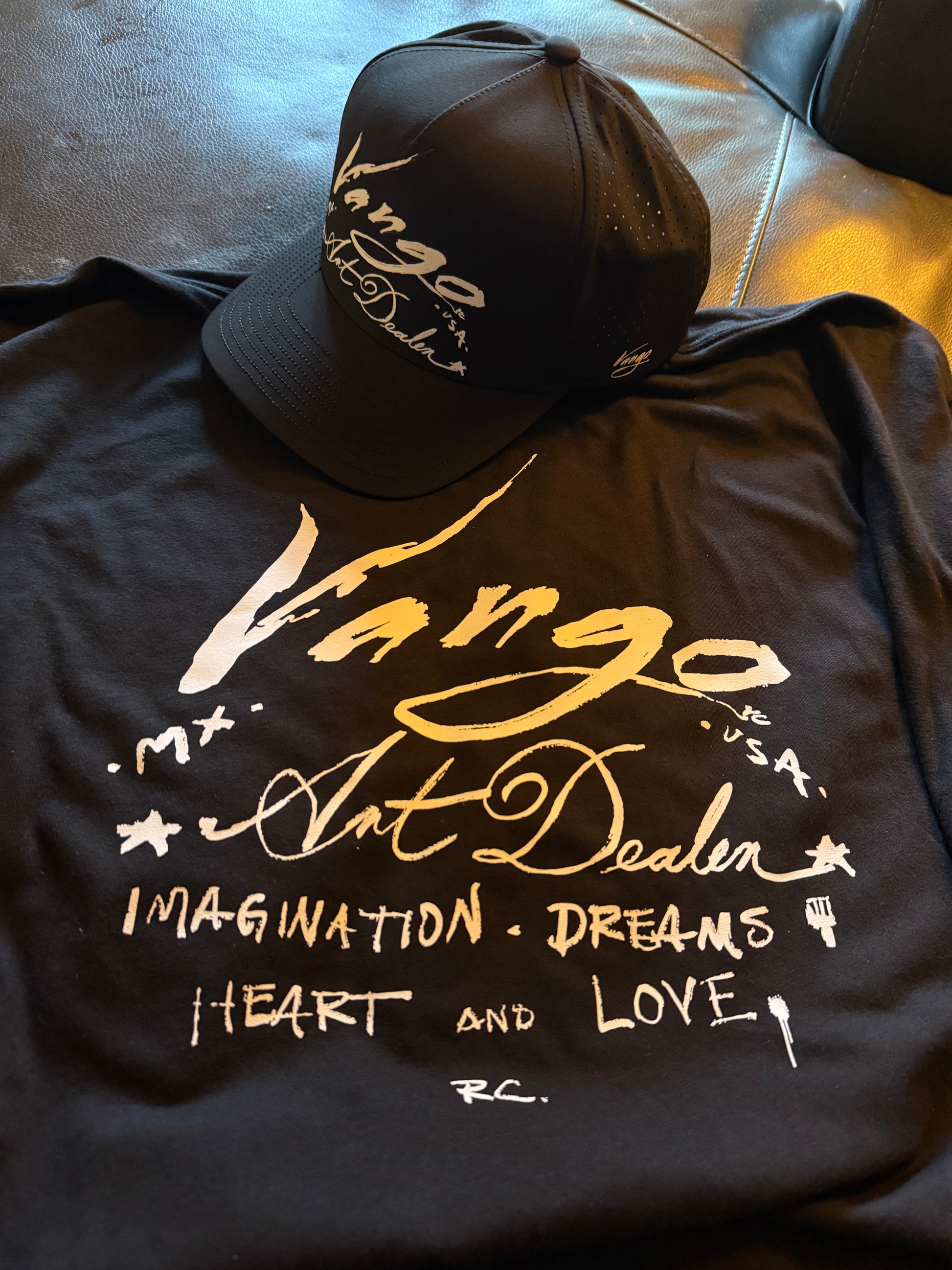Vango Art Dealer” is a fused quote created by artist Raul Carrillo, adapted into his distinctive handwritten design. This unique lettering style becomes a wearable signature, featured on hats, tees, and other apparel—transforming simple fashion pieces into bold statements of art and identity. Each item carries Raul’s creative spirit, making it more than clothing—it’s a conversation starter.